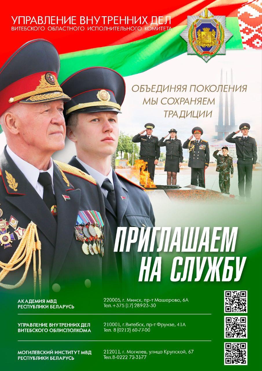 По вопросам поступления в ведомственных УО МВД вы можете обратиться в группу кадров: 8 (0212) 48-00-18, телефон дежурной службы 8 (0212)48-00-10 либо по адресу: г. Витебск, ул. Терешковой, 24